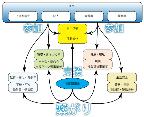 地域の様々な課題を見つけ出し、団体同士が協働して、また、市とも協働して、課題の解決をしていくための協働による地域社会づくりを目指す仕組みのひとつです。